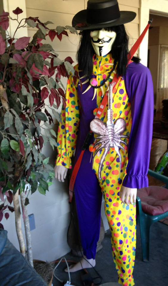 If you really want to talk about creepy, he used to be put behind our door inside and if I was making my way to the kitchen for, say a late night bowl of cereal, I would meet him on the way…in the dark…with a face hugger on his chest…holding a weapon. Needless to say I was properly frightened. I still get startled by him every once in a while and it certainly doesn’t help that we move him every few months so my terror can begin anew but, as a great fan of Allan Moore’s wonderful comic, I have grown somewhat attached to this flamboyantly colored knight on my doorstep.